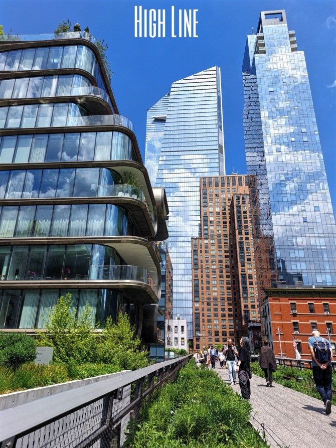 High Line jest nietypowym deptakiem – powstał kilkanaście metrów nad poziomem ulic na dawnej estakadzie kolejowej. Dzięki temu spacerując po High Line mamy możliwość spojrzenia na miasto z innej perspektywy –  znad ulic i z zapleczy budynków. High Line co chwilę się zmienia, bo twórcy deptaku miejscami wysiali na nim trawę, gdzieindziej zasadzili kwiaty lub niewielkie drzewka. Estakada jest też galerią sztuki pod gołym niebem – można się tu natknąć na rzeźby, a ściany budynków zdobią wielkie murale. Są miejsca, gdzie idziemy po szerokiej promenadzie, ale bywa też, że High Line staje się wąskim chodnikiem pośród krzewów.  To tu, to tam pozostawiono szyny – pozostałość po linii kolejowej West Side Line, zadbano także o punkty widokowe umieszczone w osiach ulic, co powoduje, że spacerowicze czują się jakby spoglądali na Nowy Jork okiem kamery umieszczonej nad sunącymi pojazdami.